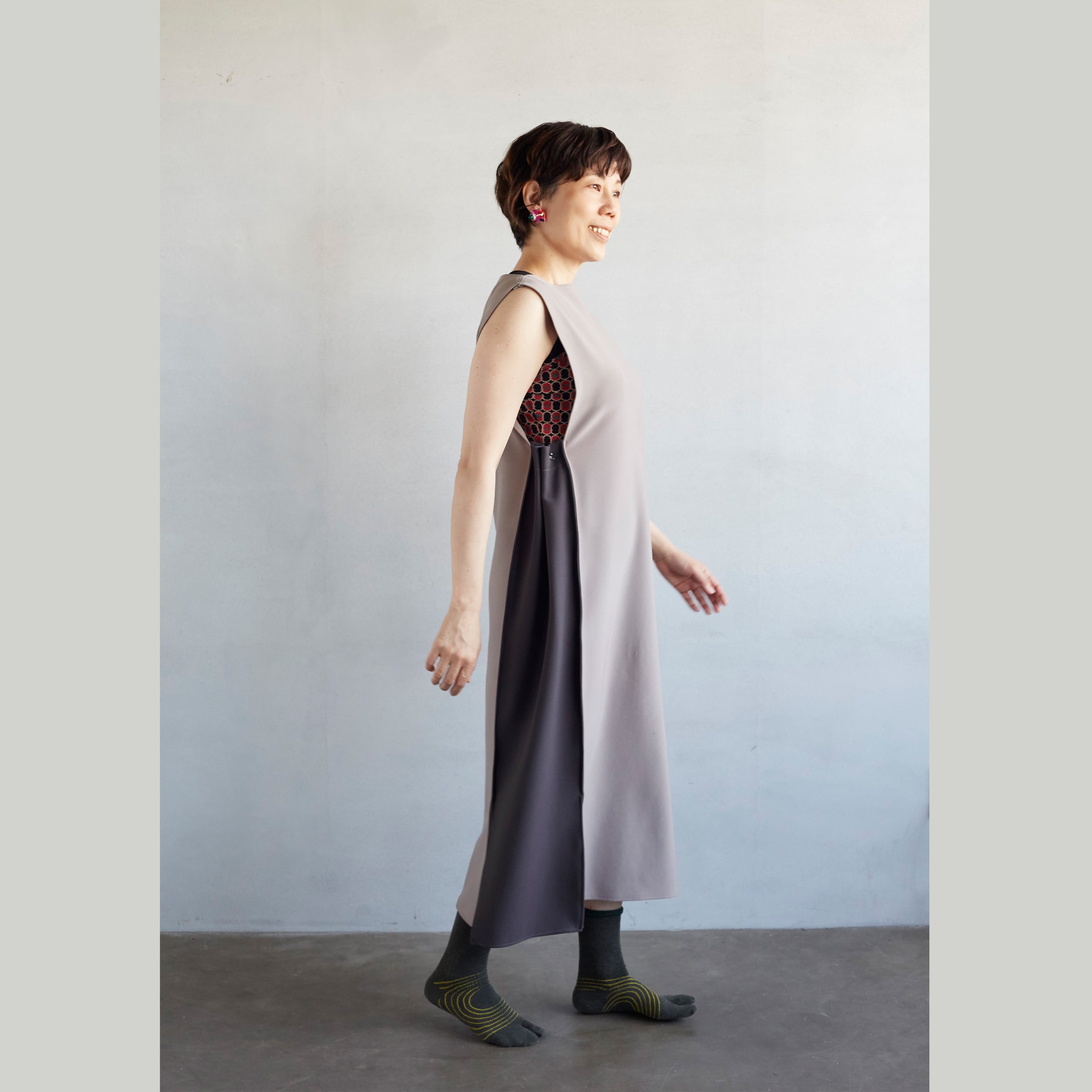 夏はこのワンピース一枚で、他の季節には袖になるスリーブ(*別売)を合わせていただくとオールシーズン着ていただけます。